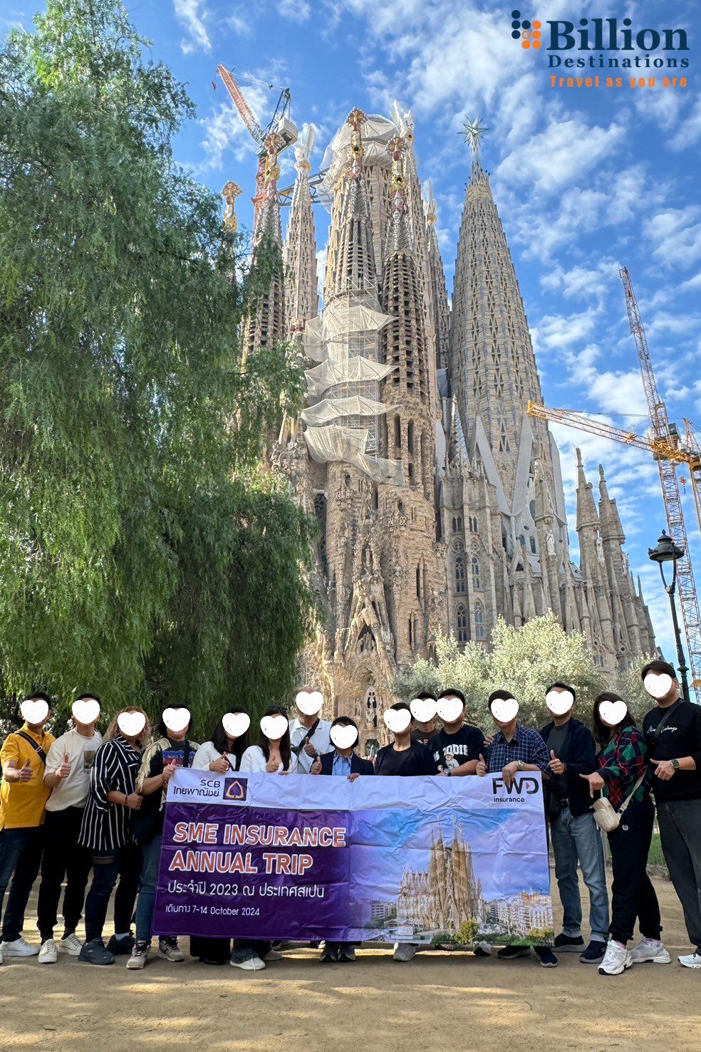 บิลเลี่ยน เดสติเนชั่น ขอขอบพระคุณ ธนาคารไทยพาณิชย์ จำกัด (มหาชน) และ บริษัท เอฟดับบลิวดี ประกันชีวิต จำกัด (มหาชน) ที่ไว้วางใจให้ทางเราได้ดูแลการจัดทริปท่องเที่ยวสุดพิเศษประจำปีค่ะ ซึ่งครั้งนี้ลูกค้าเลือกท่องเที่ยว ณ ประเทศสเปน ชมแลนด์มาร์คสำคัญ อิ่มอร่อยไปกับอาหารมื้อพิเศษพร้อมความสนุกสนาน รอยยิ้ม และความประทับใจ ทางทีมงานต้องขอบพระคุณจริงๆค่ะ